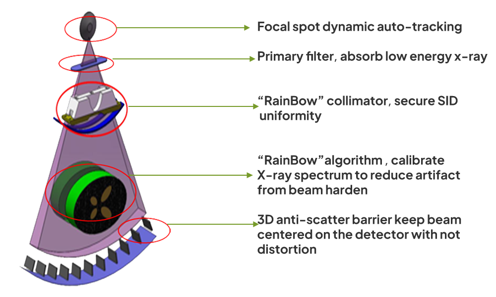| Image Quality | Spatial resolution: ≥ 21 lp/cm @ 0% MTF (X-Y plane) , ≥15 lp/cm@0% MTF (z plane) Low-contrast resolution: 2mm@0.3%@ 18mGy. Image noise: ≤0.35% (Central dose ≤40mGy) CT HU scale Standard: -1024HU ~ +3072HU Extended: -32768HU ~+32767HU | |